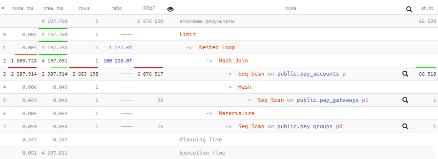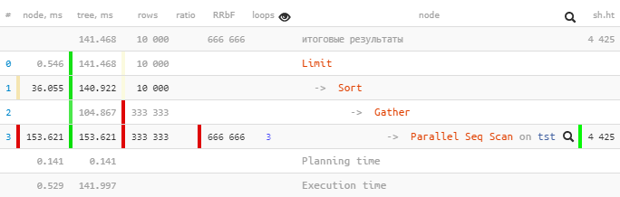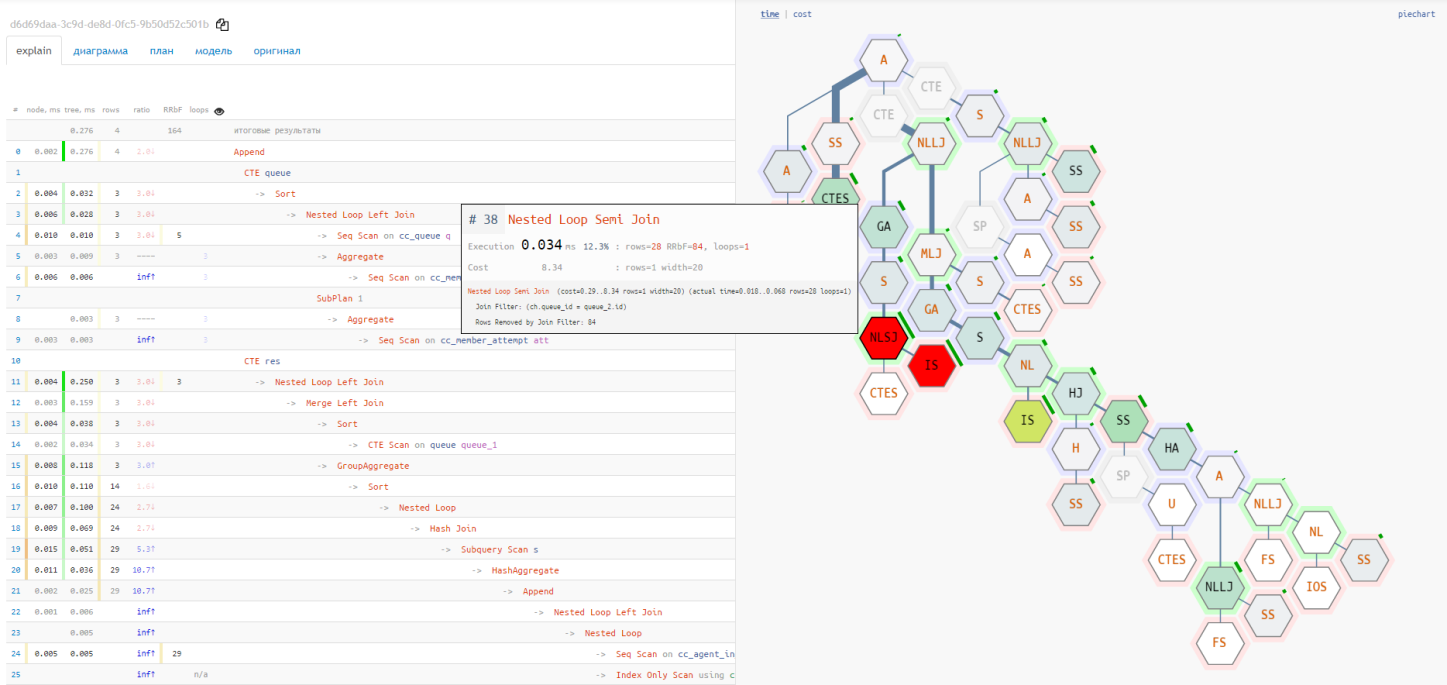 Сокращенное дерево плана позволяет легко увидеть алгоритм выполнения запроса, все числовые показатели которого выводятся отдельно и акцентируются цветовыми метками пропорционально нагрузке.