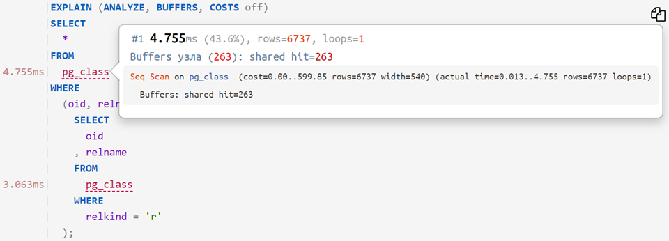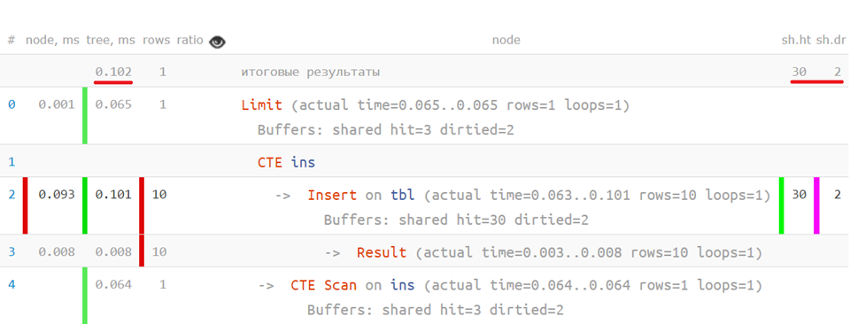 Корректный анализ CTE Scan при повторных обращениях к одной и той же CTE или частичных чтениях из wCTE правильно распределяет время и ресурсы по фактически потребившим их узлам.